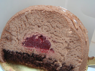 今天先吃了巧克力口味的慕絲(買蛋糕當時我迷路又餓又累根本無法再熟記那太詩情畫意的名字了),真是太好吃了!但是不喜歡吃甜的人可能會覺得太甜,慕絲很細緻緊密、冰冰涼涼的入口即化,而且巧克力中帶有一點莓果的酸甜香味(很多蛋糕中的藍莓等添加物都很一般,甚至是有點人工的味道,但是這塊蛋糕的莓果吃起來不會有那種很人工的果醬感,甚至還可以吃到一點莓果的籽),讓放鬆的下班時光很幸福,我文筆不好,不太會描述它的好吃,所以就讓"斷面秀"來記錄它吧!