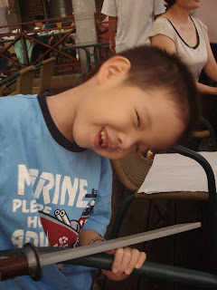 他很喜歡用怪怪的姿勢照相,調皮的孩子,要照到不晃的照片還真不容易,那把刀是最近他最愛的忍者龜刀,他最喜歡玩的遊戲之一就是戴上忍者龜面具,穿著一條內褲,背著綠色背包,把刀子插在內褲旁邊假裝是忍者龜跟我打架,每次他刺到我我都還要假裝很誇張地死掉^^"