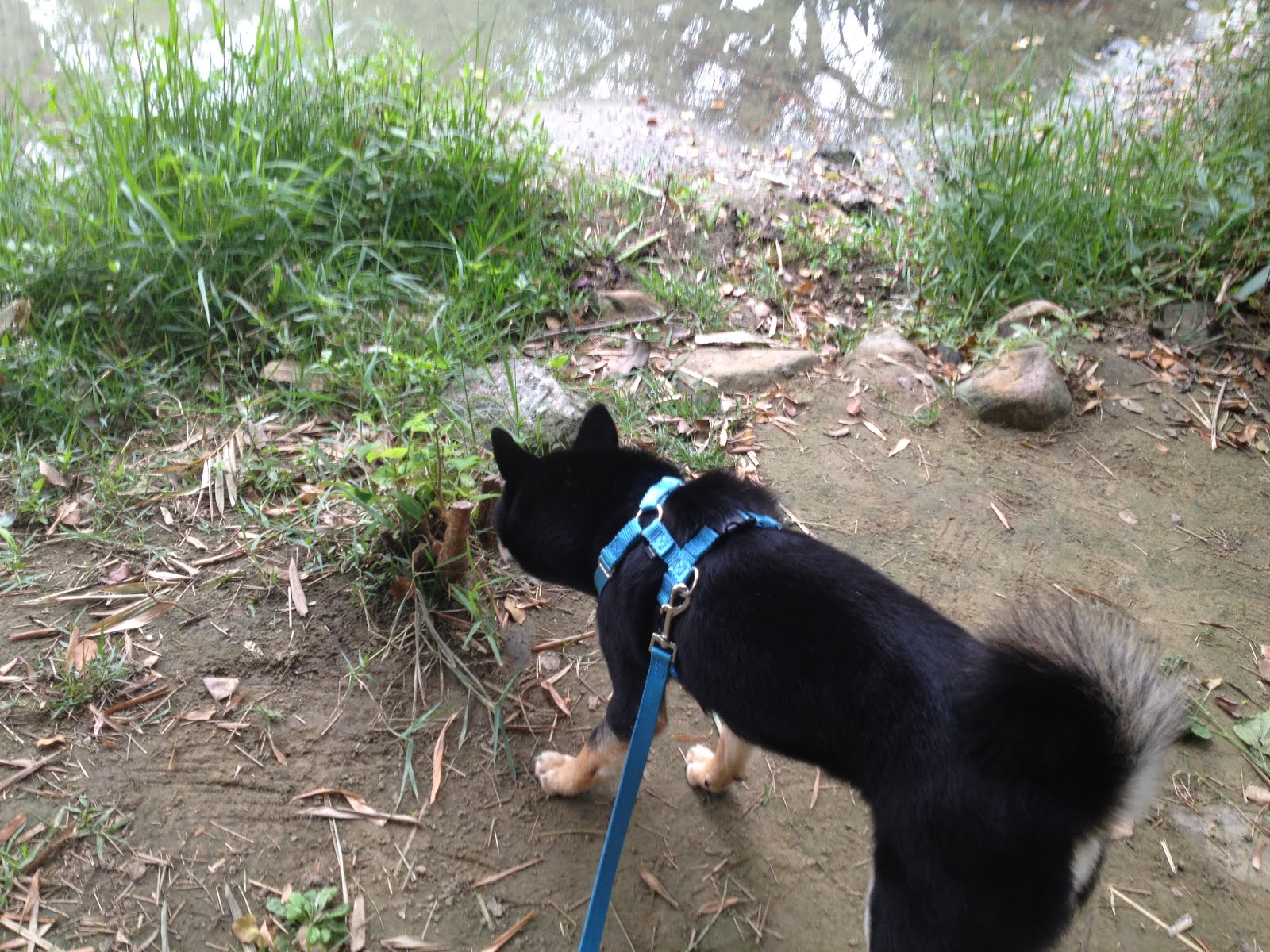 先遇到一群講話牽著單車的外國人(老媽正在處理危機顧不得照相),雖然離他們有些距離,但健事實上也做出了一些動作表達他的不安、不確定,先是注意到遠方的他們,稍微愣住了0.幾秒、左右走了幾步,然後眼神往上看了我一眼,我馬上跟他說沒事,接著他轉身背對那群人開始嗅聞,此時就開始稱讚他好乖。