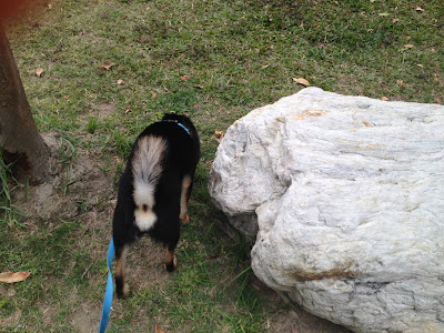在少爺探索完以後跟他說走了,他就跟著我往機車的方向走了,在往機車的方向他也有到處聞了一下,也要停下來讓他探索一下稱讚他。