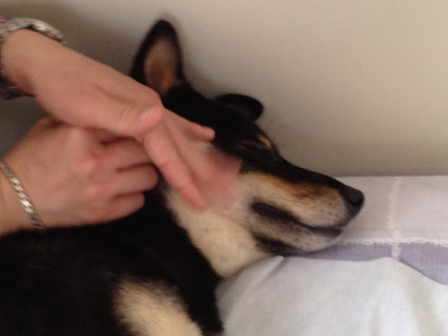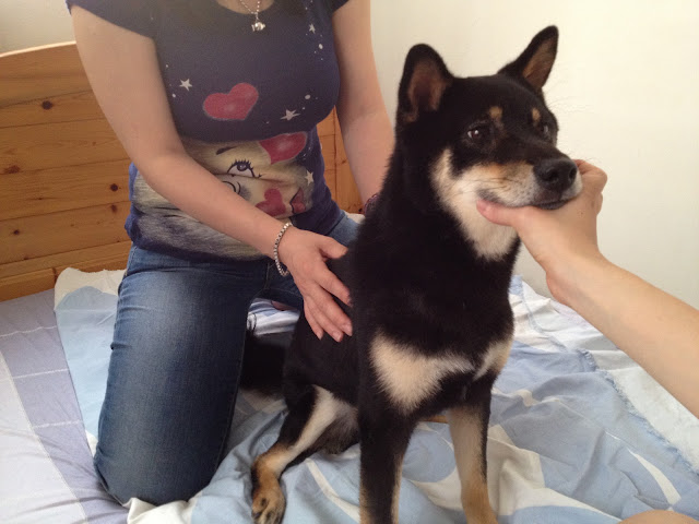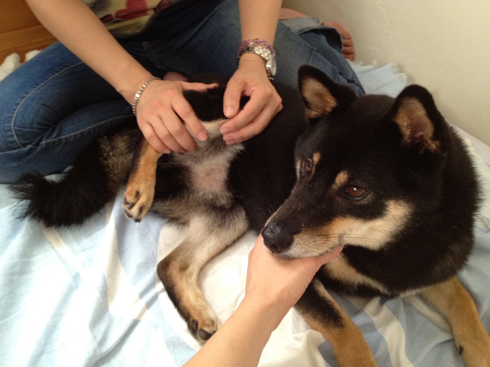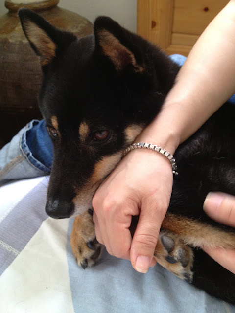 而飼主我的角色就是要幫忙健放鬆,於是我的手就讓健靠著(這個動作會讓健感到安全)